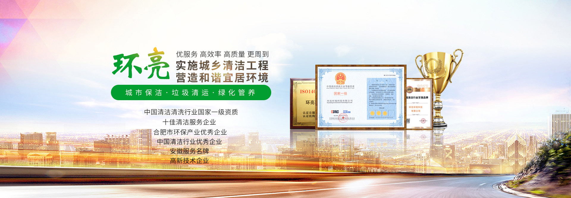 (1)獲得中國清潔行業“國家一級”資質,第七屆中國清潔(環衛)行業推優“十佳清潔服務企業 獎”;第八屆中國清潔(環衛)行業推優“優秀企業獎”;第九屆中國清潔行業推優“新銳企 業獎”;被評為“合肥市環保產業優秀企業”。